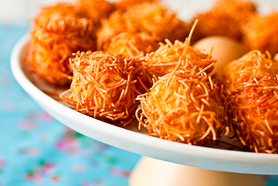 | Bolinho de milho verde empanado com macarrão cabelinho de anjo |