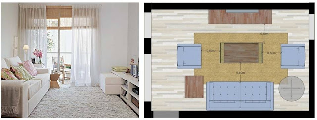 Temos 2 exemplos, sala de estar e tv decorada. E planta baixa de layout dos móveis com itens que iremos falar.